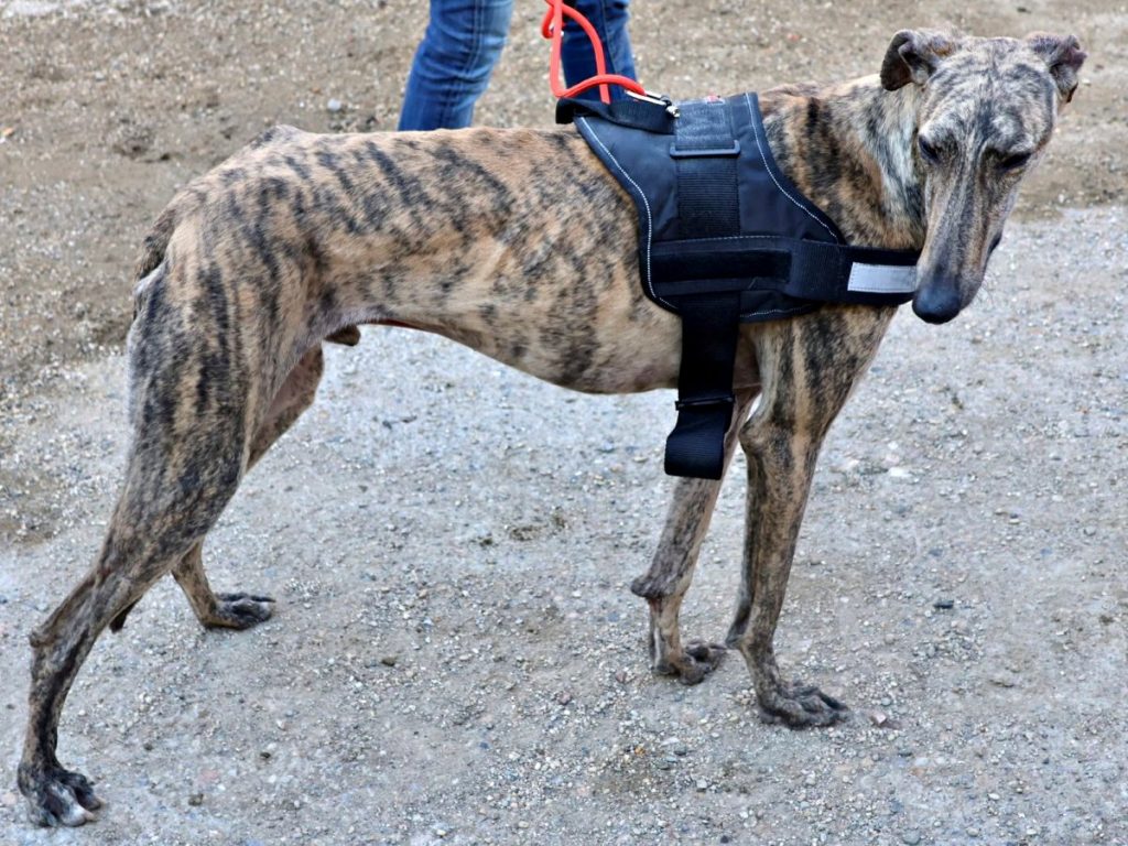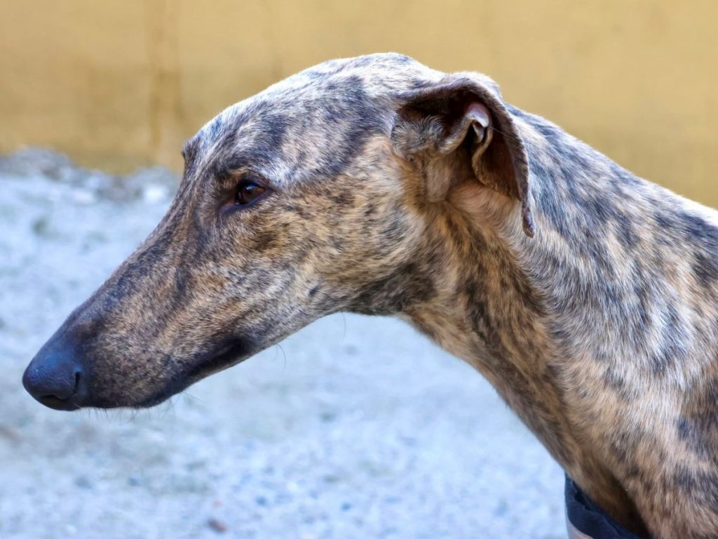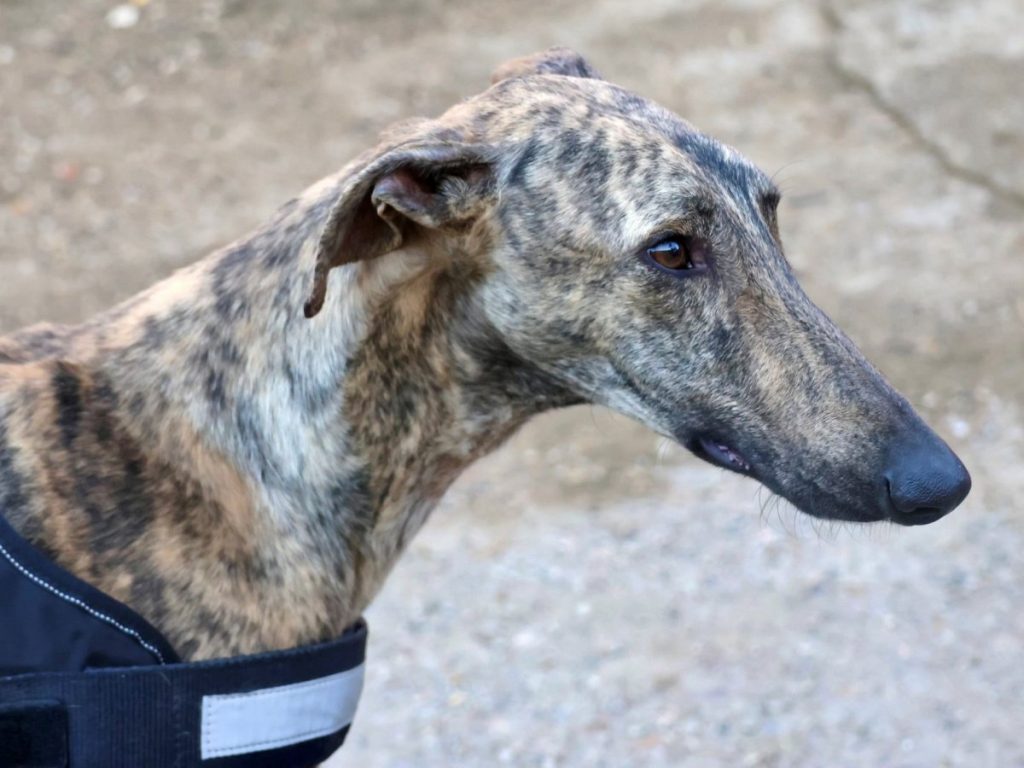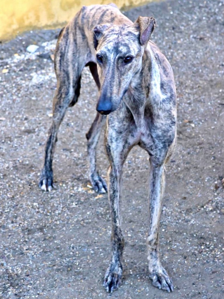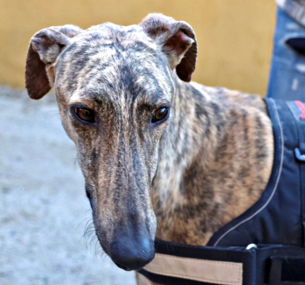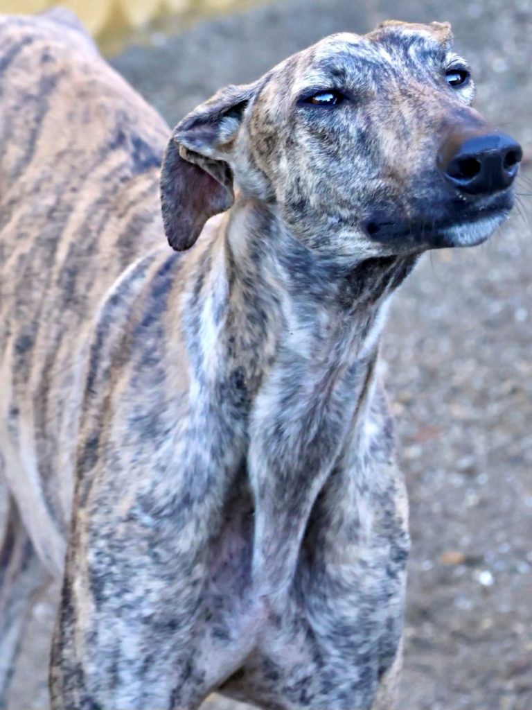 Ein Bild von einem Galgo ist unser eleganter Riese Rayo mit seinem gestromten Fell und sanftem Blick. Rayo zeigt sich im Tierheim galgo-typisch: