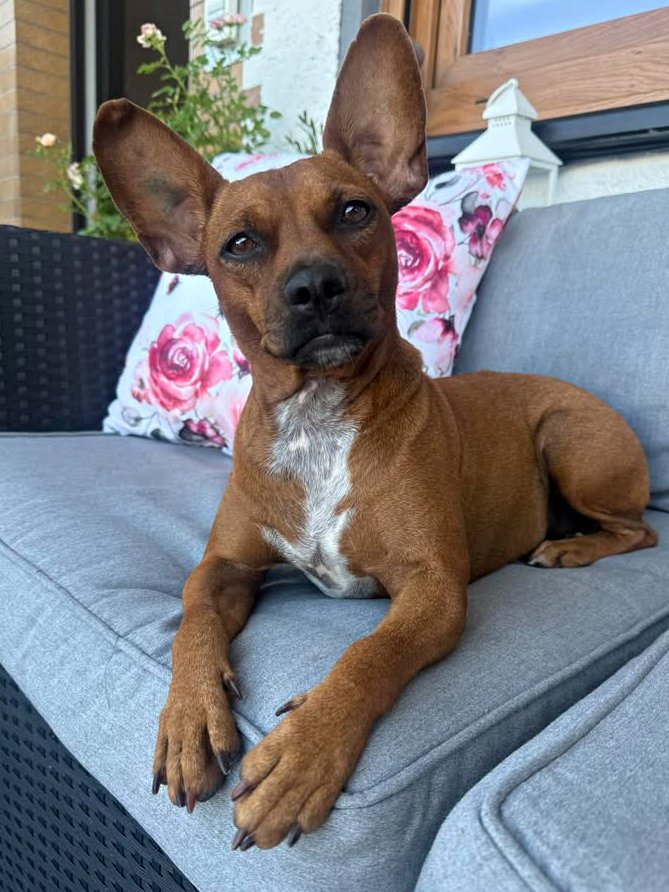 Yuki (4495), Mischlings-Hündin, geboren am 05.05.2022, 33 cm hoch und wiegt 9 kg. Kastriert – geimpft – gechipt – auf Mittelmeerkrankheiten getestet.
